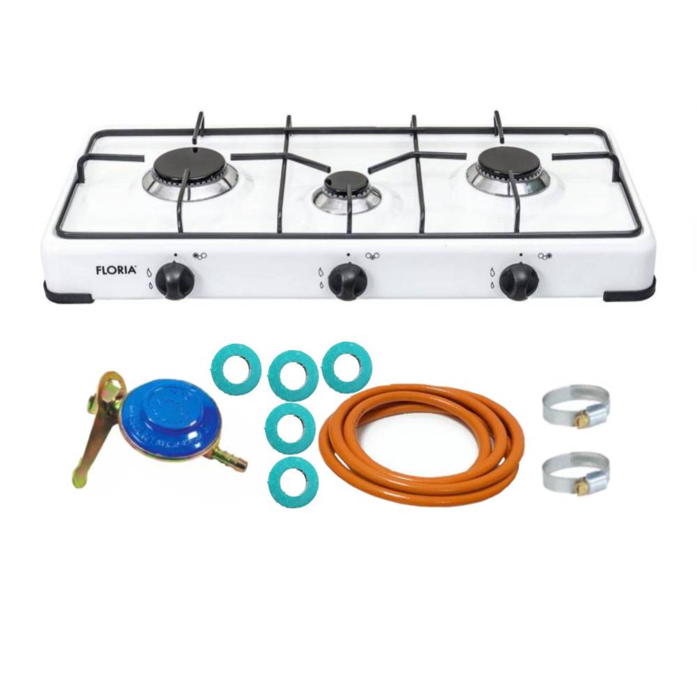 Aragaz cu 3 ochiuri, Alb, Floria si chit racordare pentru Butelie - acest set contine tot ce este necesar pentru racordarea aragazului la butelie si este ideal pentru pasionatii de excursii, calatorii in aer liber cu familia sau prietenii, picnicuri sau acasa in bucatariile de vara, unde nu exista retea de gaze naturale.