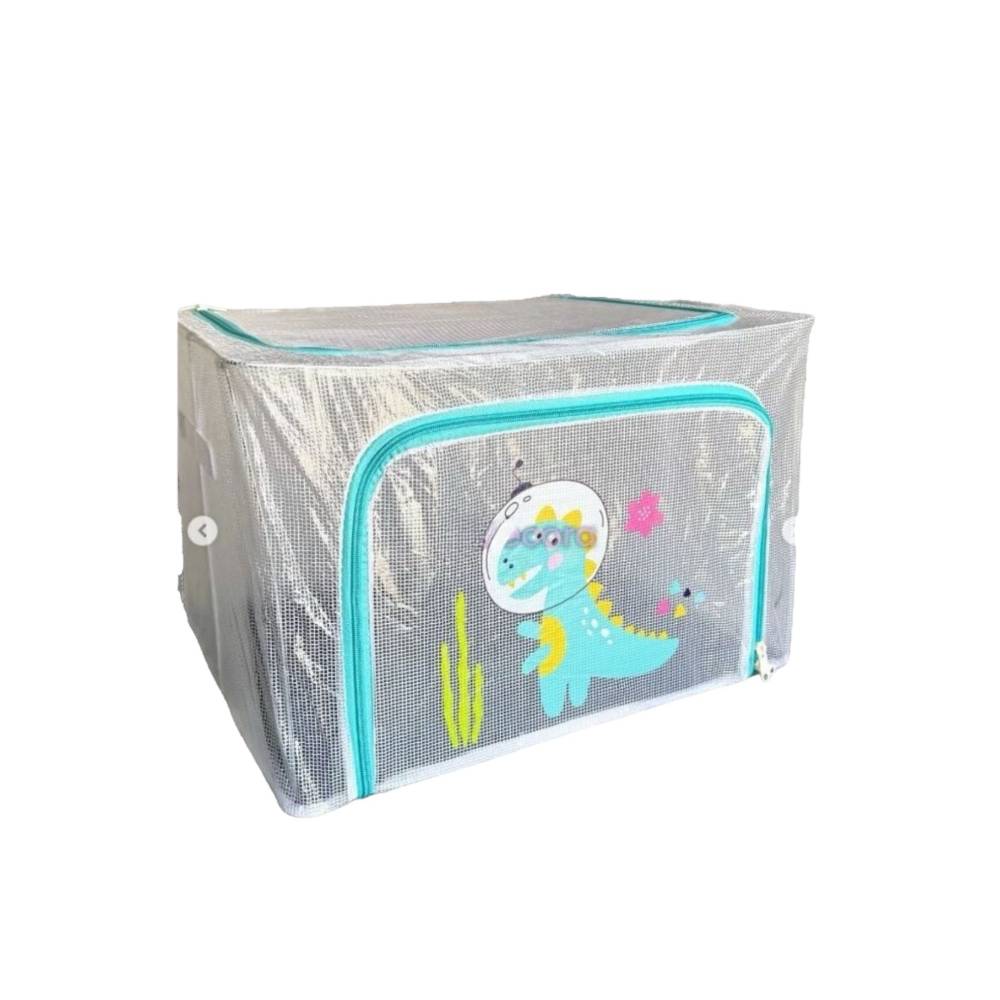 Cutie depozitare 66L, transparenta, model dinozaur - aceasta cutie este un produs foarte practic si util in orice casa pentru depozitarea hainelor, a jucariilor sau pentru diverse articole, are o capacitate de 66 litri si este transparenta cu model dinozaur.