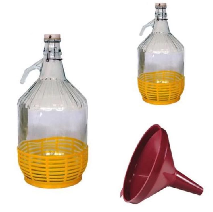 Damigeana 5L din sticla, Dop cu sarma, Inchidere ermetica x 2 + Palnie mare 20 cm
