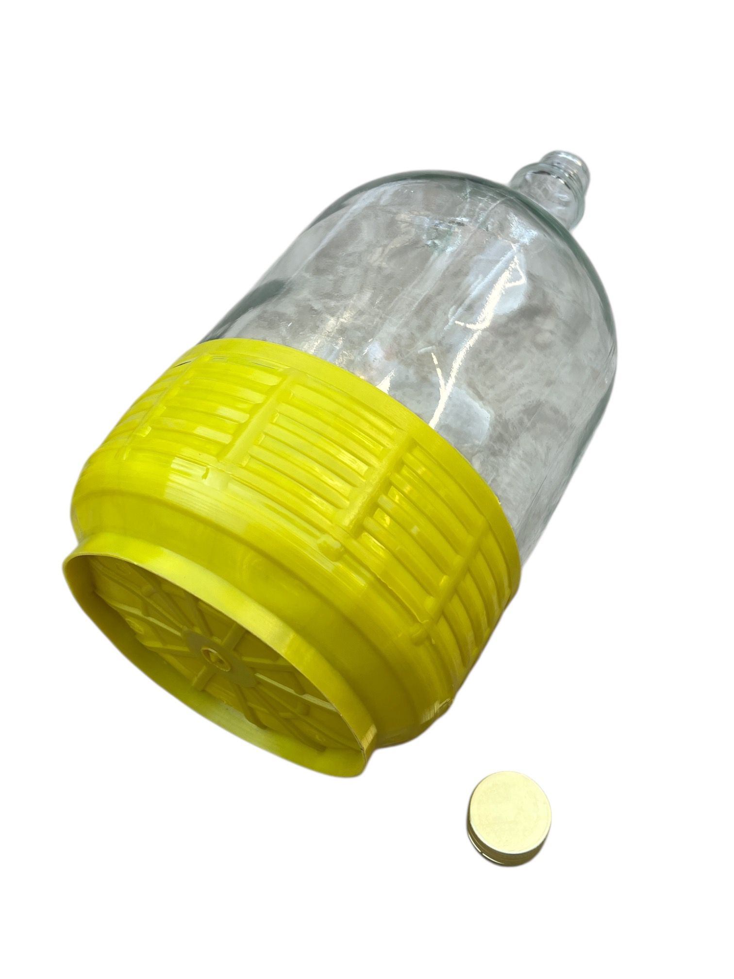 Damigeana 5L din sticla in cos din plastic cu dop prin infiletare - aceasta damigeana este recomandata pentru conservarea si transportul vinului, tuicii, visinatei sau a altor tipuri de bauturi alcoolice fie la nivel casnic, cat si la nivel industrial.