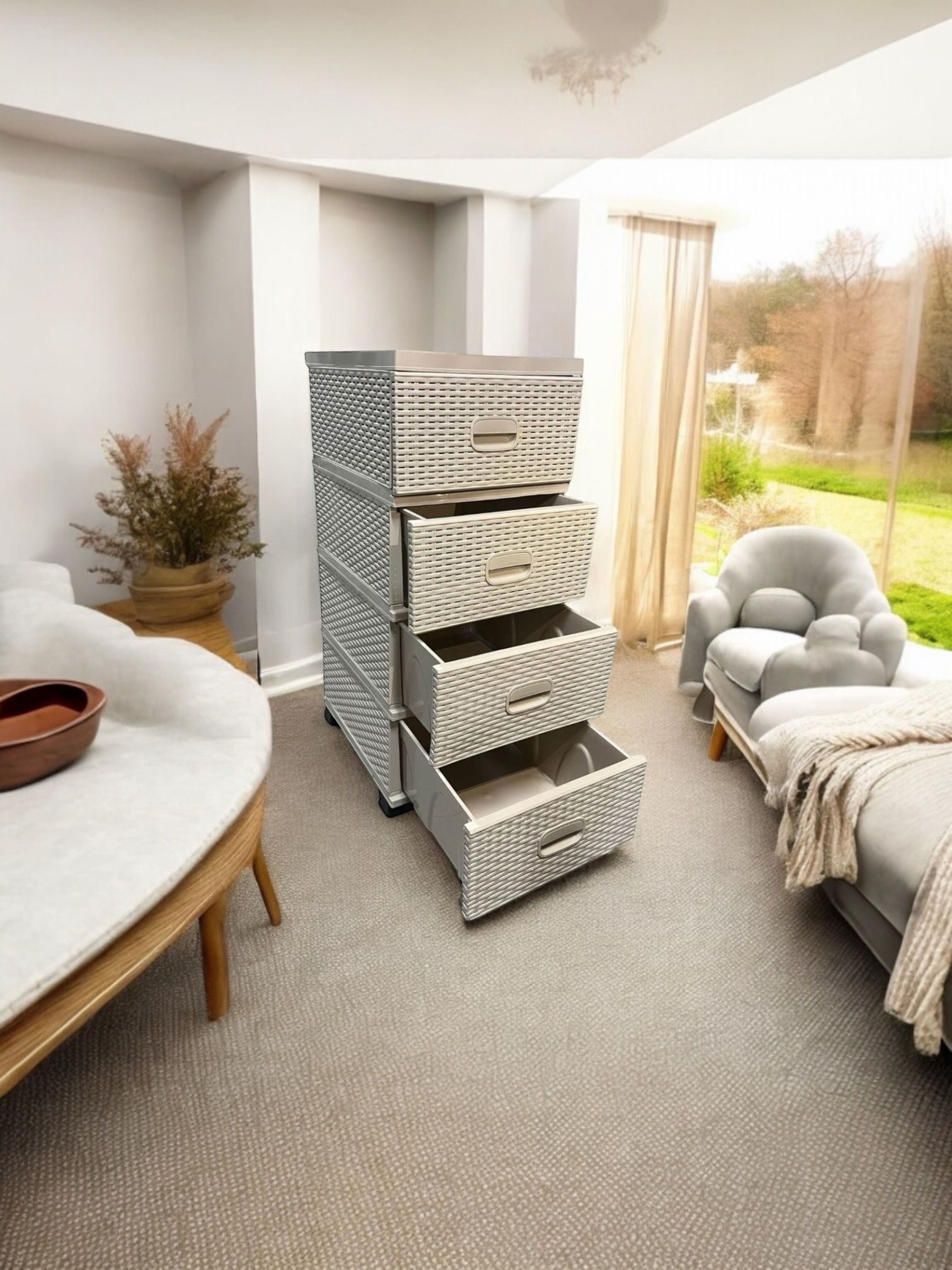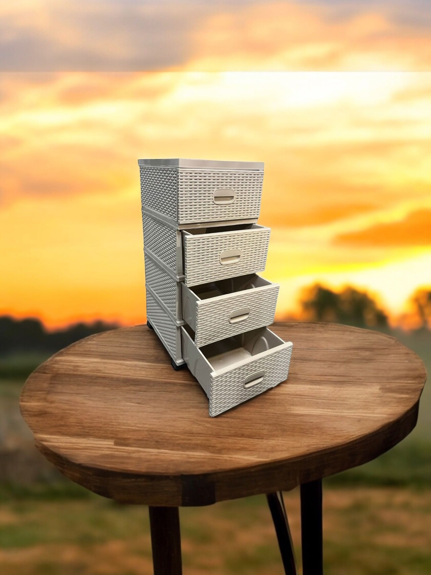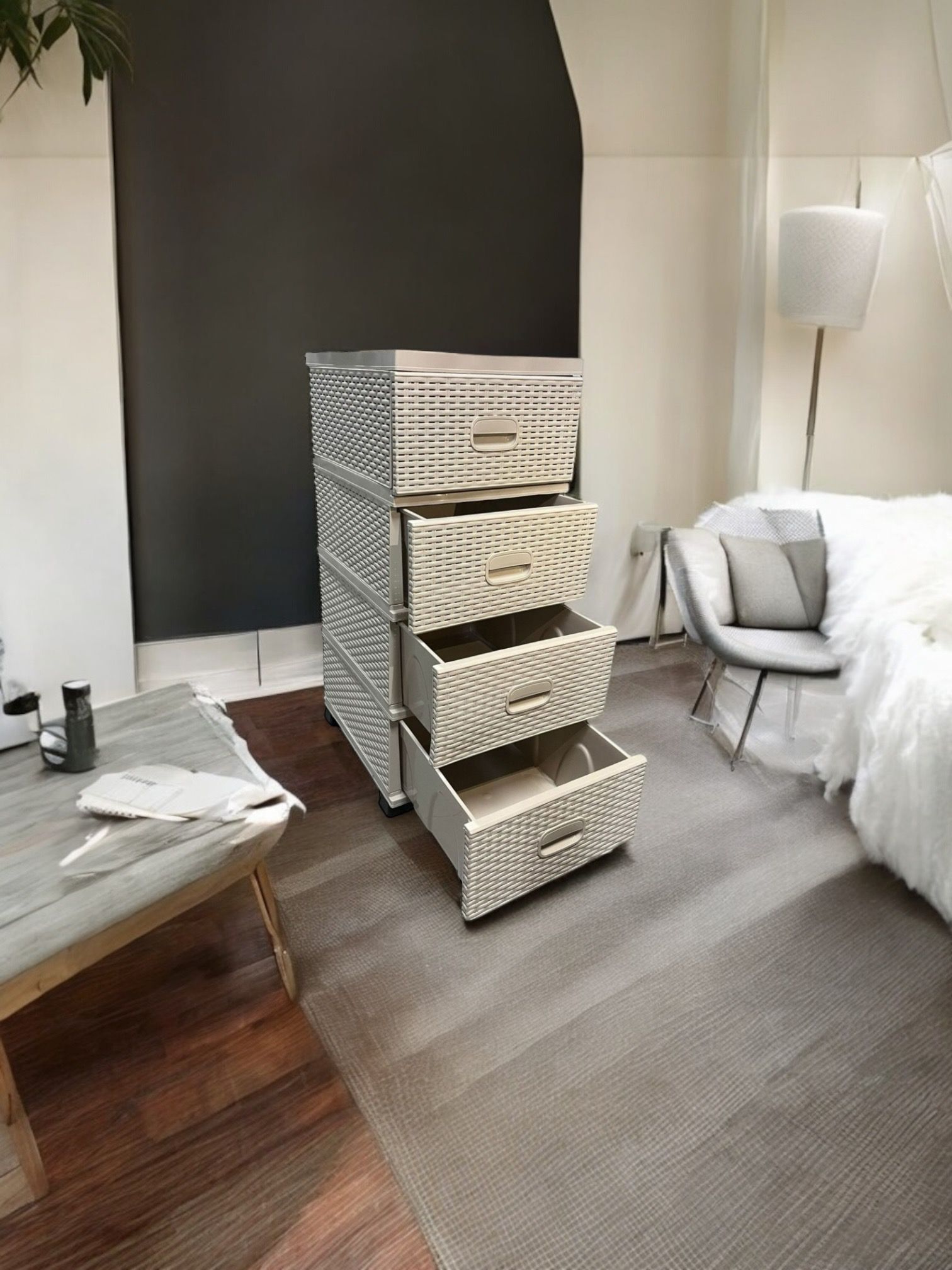 ✔️Dulapul tip ratan cu 4 sertare din material plastic a fost fabricat sa reziste cu succes intrebuintarilor casnice, actiunilor mecanice repetate, umiditatii si nu in ultimul rand, greutatii produselor, avand patru picioare de sustinere pentru a-i oferi o stabilitate sporita.