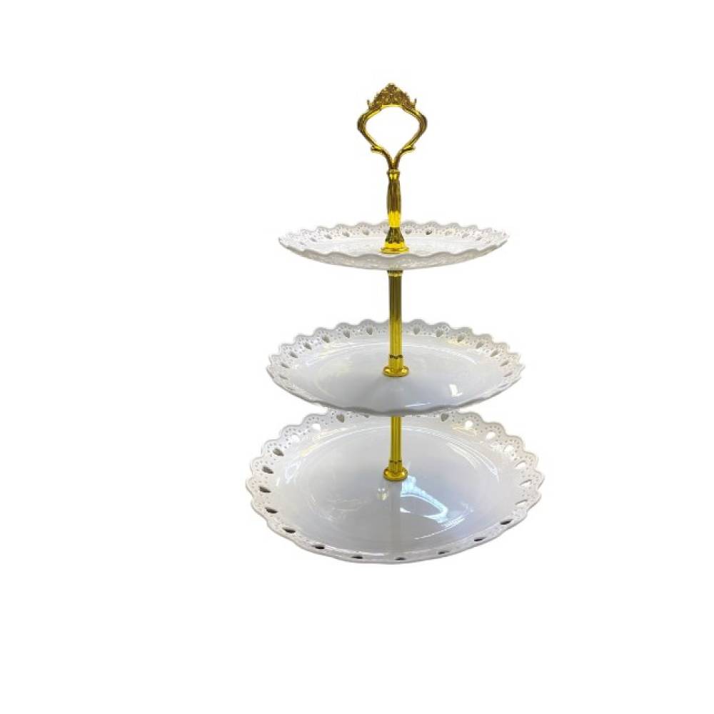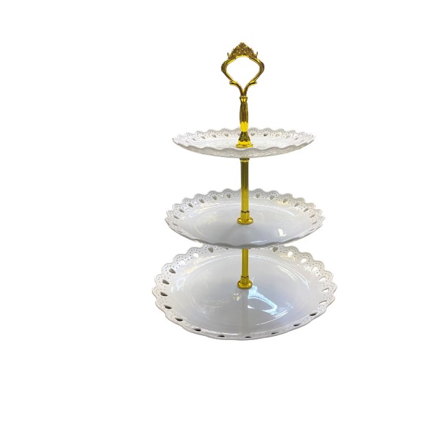 Etajera pentru fructe si prajituri cu 3 etaje - aceasta etajera se foloseste pentru expunerea prajiturilor, a gustarilor sau a fructelor pe mesele de la petreceri, nunti sau botezuri, aducand o nota de eleganta si rafinament evenimentului tau.