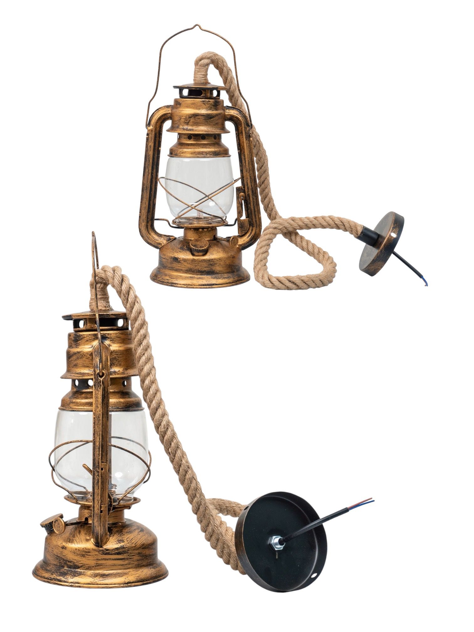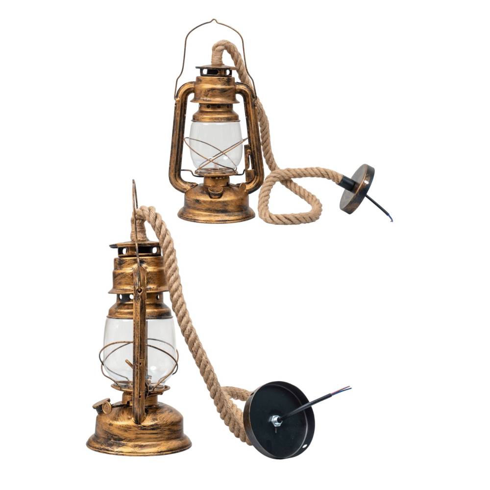 Lampa tip felinar 2 in 1 cu funie, pendul - acest felinar se poate folosi atat cu bec E27 cat si pe gaz, oferind oamenilor o senzatie de liniste si siguranta si este prevazut cu maner pentru a putea fi agatat.