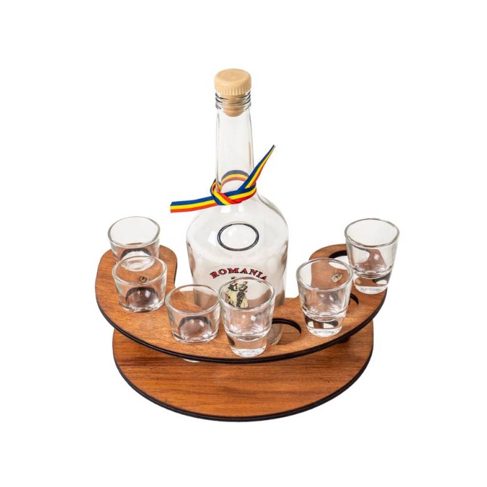Mini bar, suport lemn cu sticla si 6 pahare 30ml - acest set estepotrivit atat pentru uz casnic, cat si pentru crame oferind o nota de autenticitate si un plus de caldura in orice spatiu.