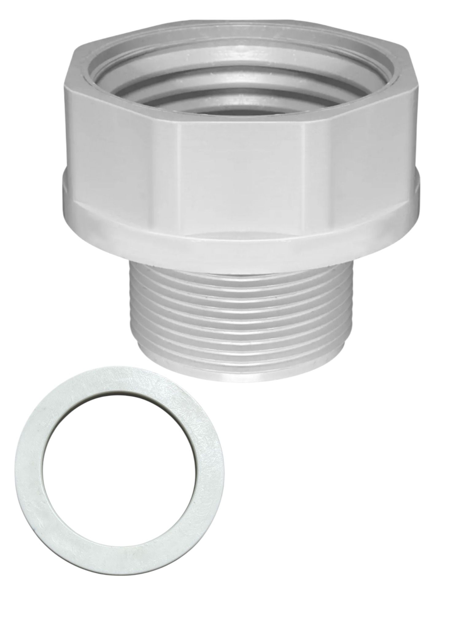 ✅ Reductie bazin IBC 1", filet exterior cu garnitura - aceasta reductie este fabricata din polipropilena, are filetul interior de 63mm, pas mare si diametrul la iesire 1".