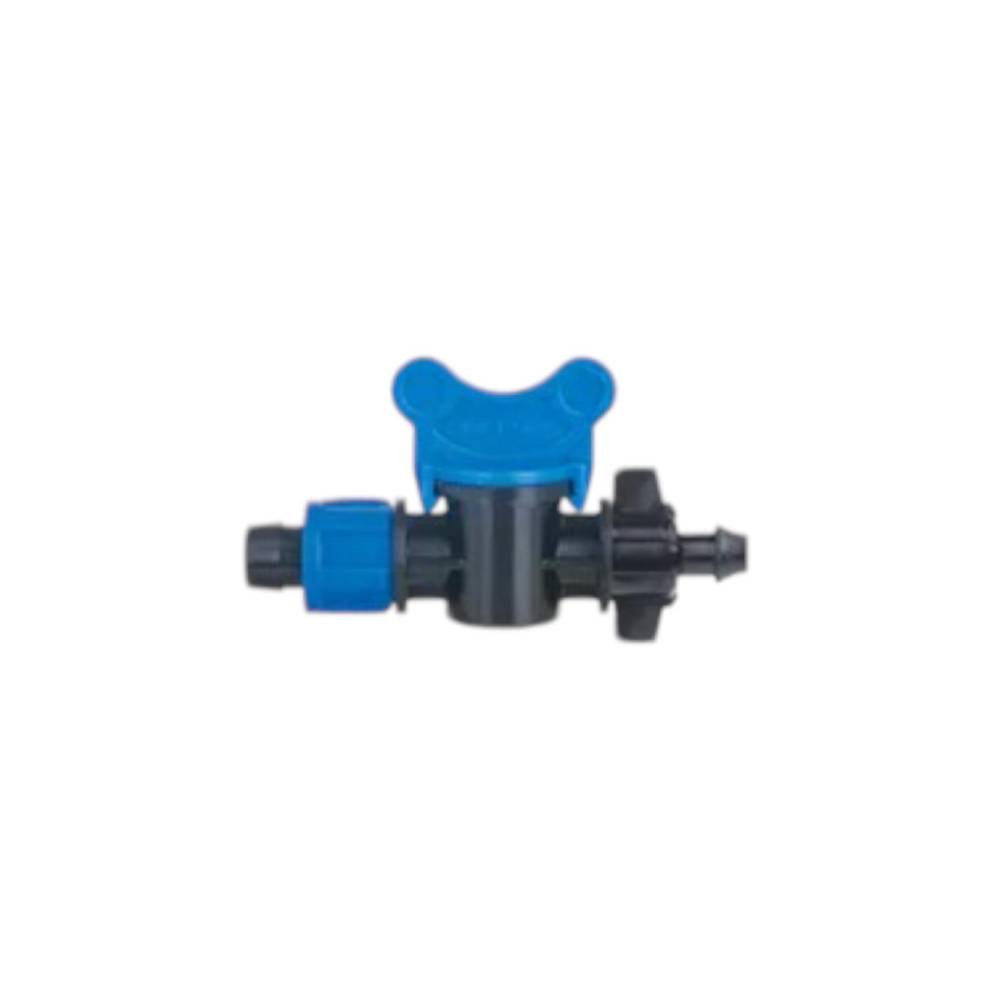 Robinet tub picurare 16x8mm, cu contrapiulita - este folosit pentru conectarea tubului de picurare cu diametru de 16mm la conducta principala de apa (teava PEHD), cu posibilitatea de reglaj sau inchidere a debitului apei.