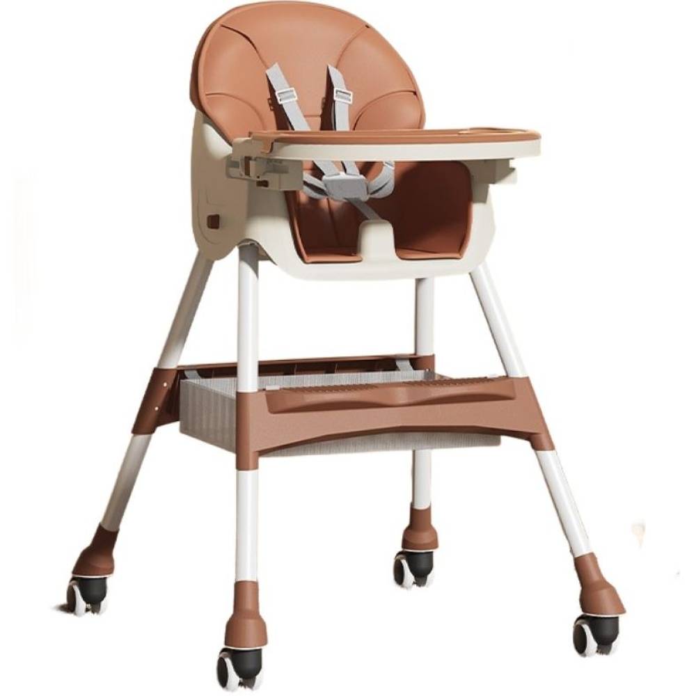 Scaun masa bebelusi si copii, pliabil, cu roti, piele artificiala, Maro