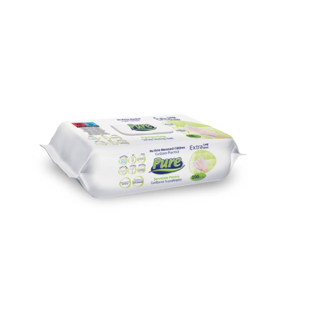 Servetele umede cu bicarbonat si otet, pentru suprafete multiple, 100buc/set, Pure - aceste servetele sunt solutia ideala pentru curatarea eficienta si rapida a tuturor tipurilor de suprafete din casa: sticla geamuri sau oglinzi, electrocasnice, elemente de mobilier canapele sau mobila, covoare sau diverse gadget-uri telefoane tablete, televizoare, laptop-uri etc.