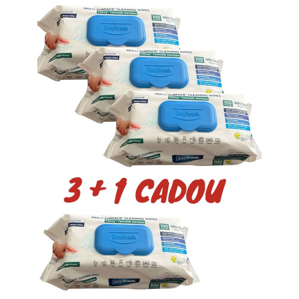 Set 3+1 cadou Servetele umede multisuprafete cu Bicarbonat si otet, DeepFresh - aceste servetele sunt foarte eficiente pentru curatarea eficienta si rapida a tuturor tipurilor de suprafete din casa: sticla geamuri sau oglinzi, electrocasnice, elemente de mobilier canapele sau mobila, covoare sau diverse gadget-uri telefoane tablete, televizoare, laptop-uri etc.