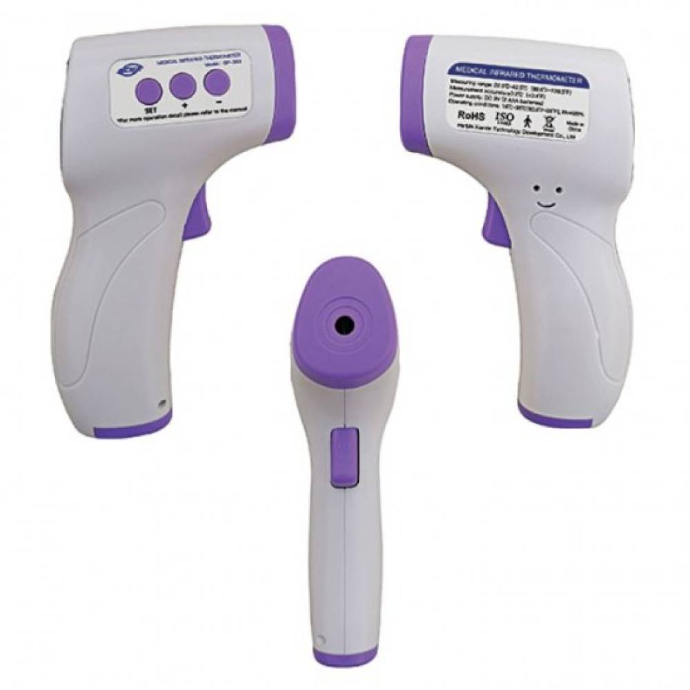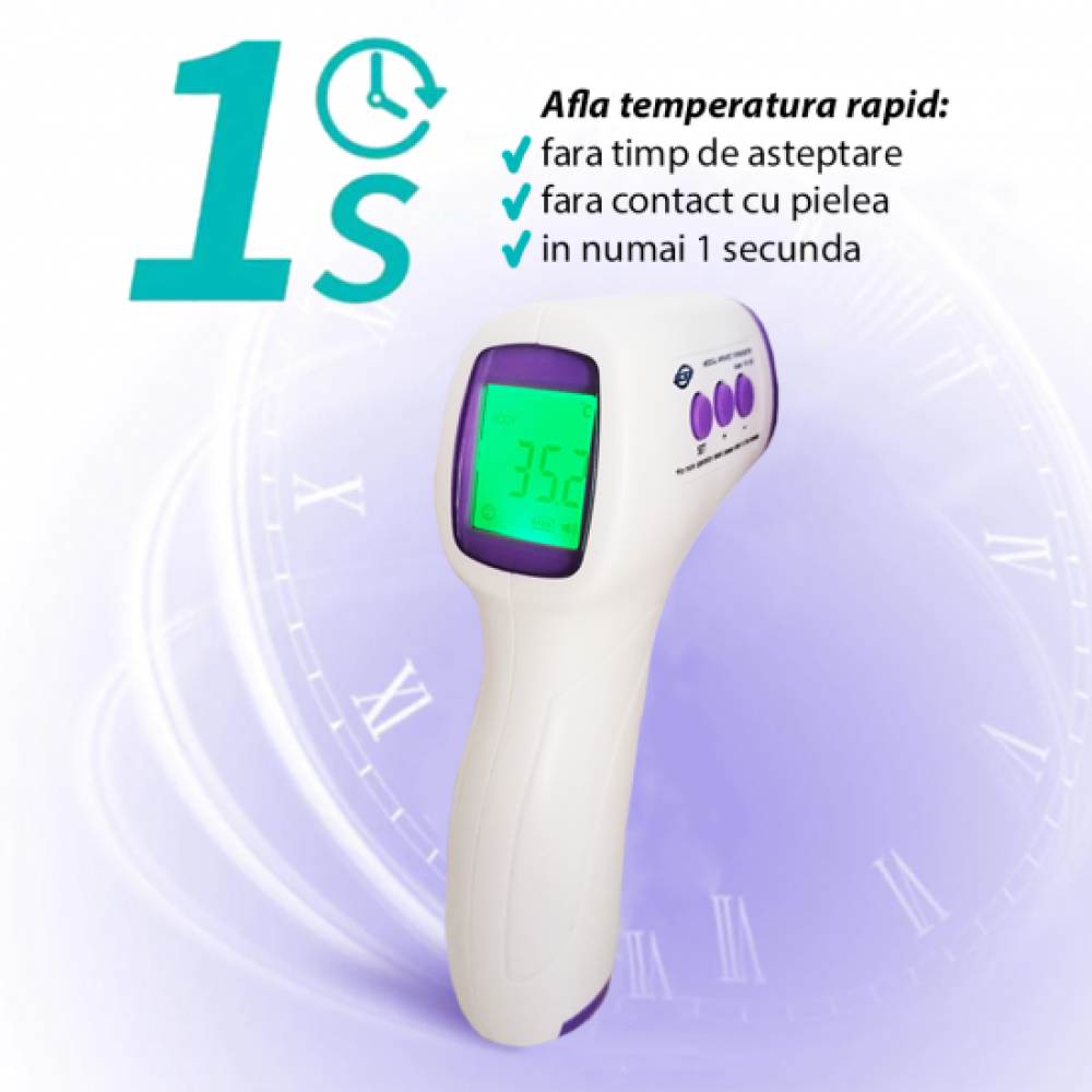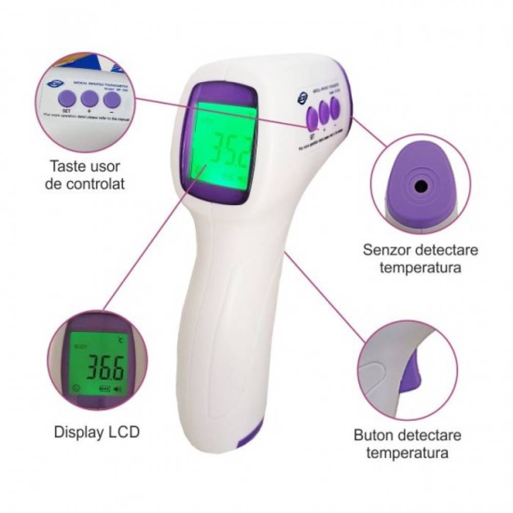 Modalitate de folosire: Indreptati termometrul spre frunte si mentineti-l in pozitie verticala. Pentru un rezultat corect, mentineti o distanta de 3-5 cm intre terometru si piele. Dupa apasarea butonului aflat pe maner, termometrul va emite un sunet, si apoi, dupa o secunda, va afisa temperatura pe display. Daca temperatura se afla in limite normale, displayul va afisa o culoare verde si va emite un sunet de confirmare. Daca temperatura depaseste valoarea de 38°C (temperatura default), displayul va afisa o culoare rosie si va emite 3 sunete scurte de atentionare.